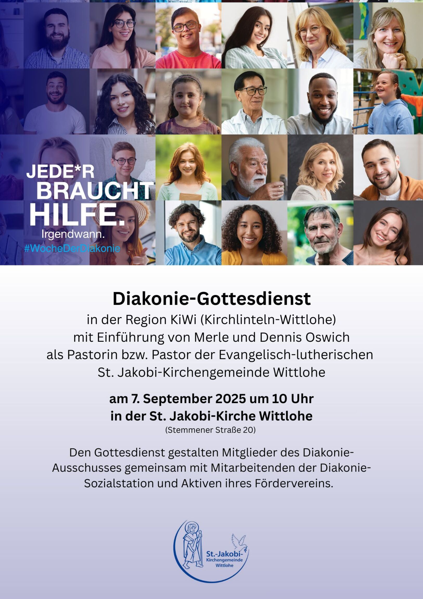 Am Sonntag den 07.09.2025 um 10 Uhr findet der Diakonie-Gottesdienst in der St.-Jakobi-Kirche Wittlohe statt. In diesem Gottesdienst wird außerdem die Einführung von Merle und Dennis Oswich stattfinden.