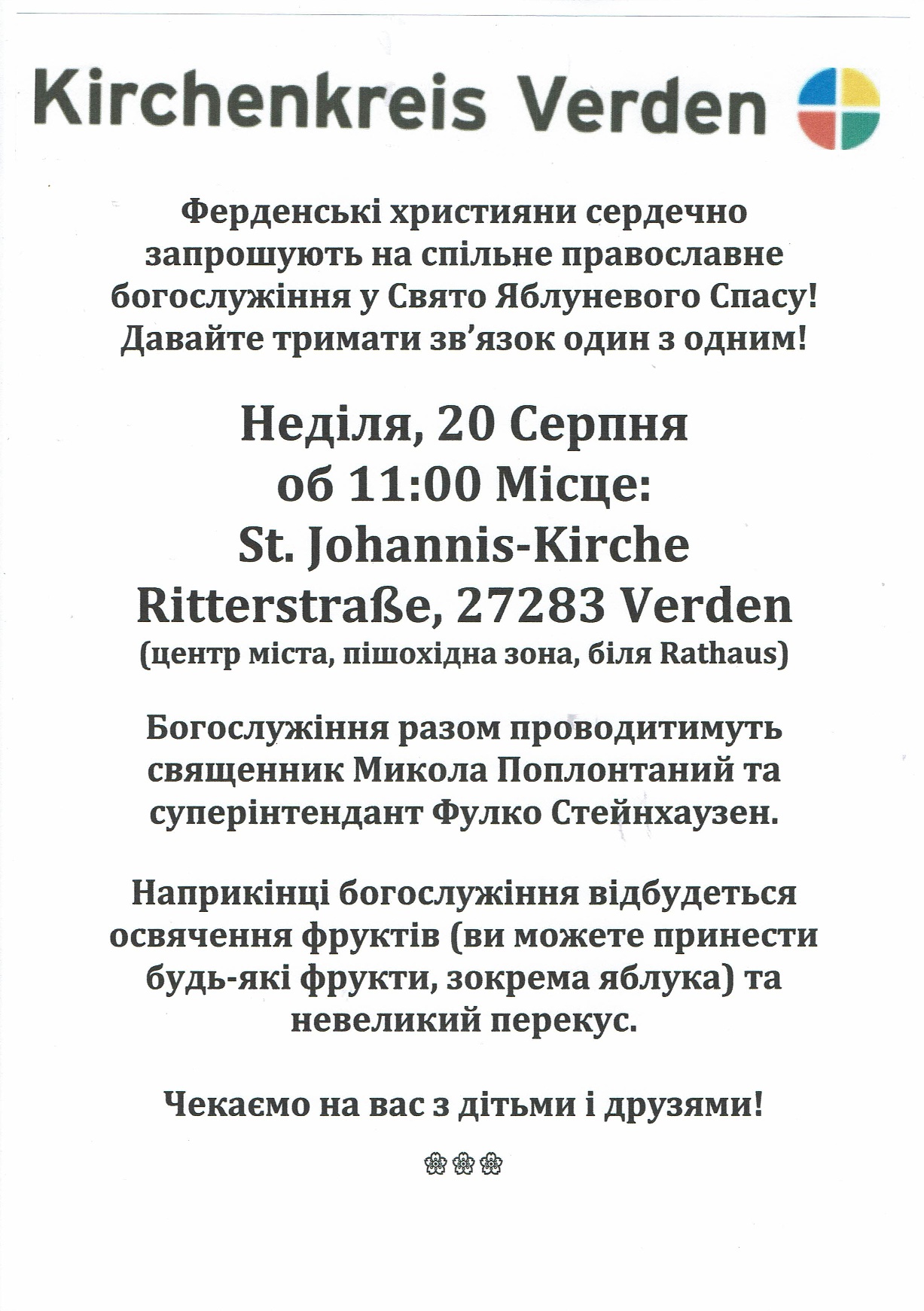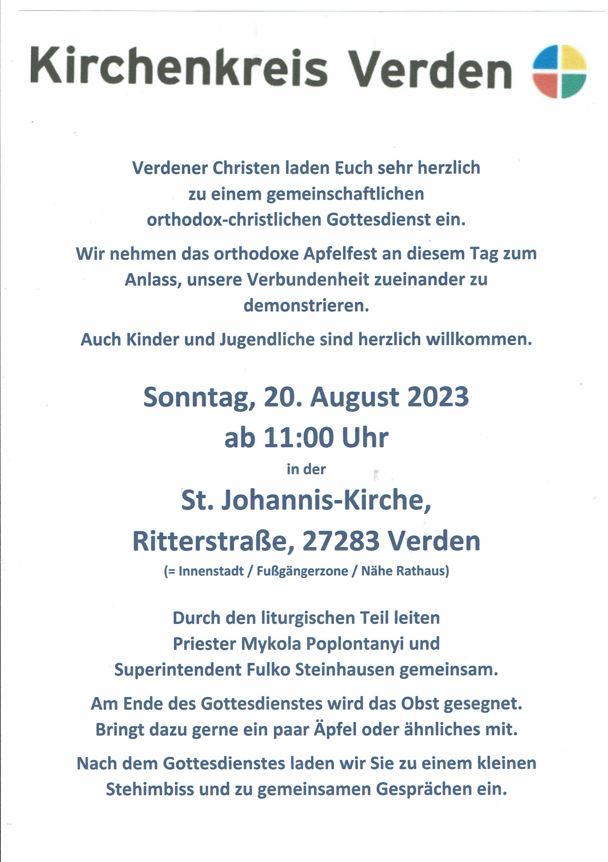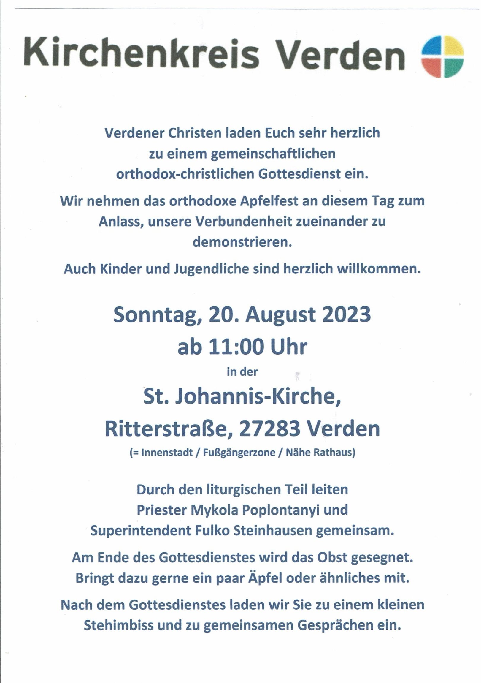 Zu einer kleinen Tradition in der Stadt sind schon die gemeinsamen Gottesdienste mit orthodoxen Gläubigen geworden. Verdener Christen laden jetzt erneut zu einem besonderen Fest ein und möchten damit ihre Verbundenheit zeigen: Am Sonntag, 20. August, wird um 11 Uhr in der St. Johanniskirche in Verden (Ritterstraße) ein gemeinschaftlicher orthodox-christlicher Gottesdienst gefeiert. Anlass dafür ist das orthodoxe Apfelfest. Den liturgischen Teil leiten Priester Mykola Poplontanyi aus Bremen und Superintendent Fulko Steinhausen gemeinsam. Am Ende des Gottesdienstes wird das Obst nach der Tradition gesegnet, deshalb dürfen gerne Äpfel oder anderes Obst mitgebracht werden. Im Anschluss an den Gottesdienst wird zu einem kleinen Steh-Imbiss und Gesprächen in der Kirche eingeladen.
