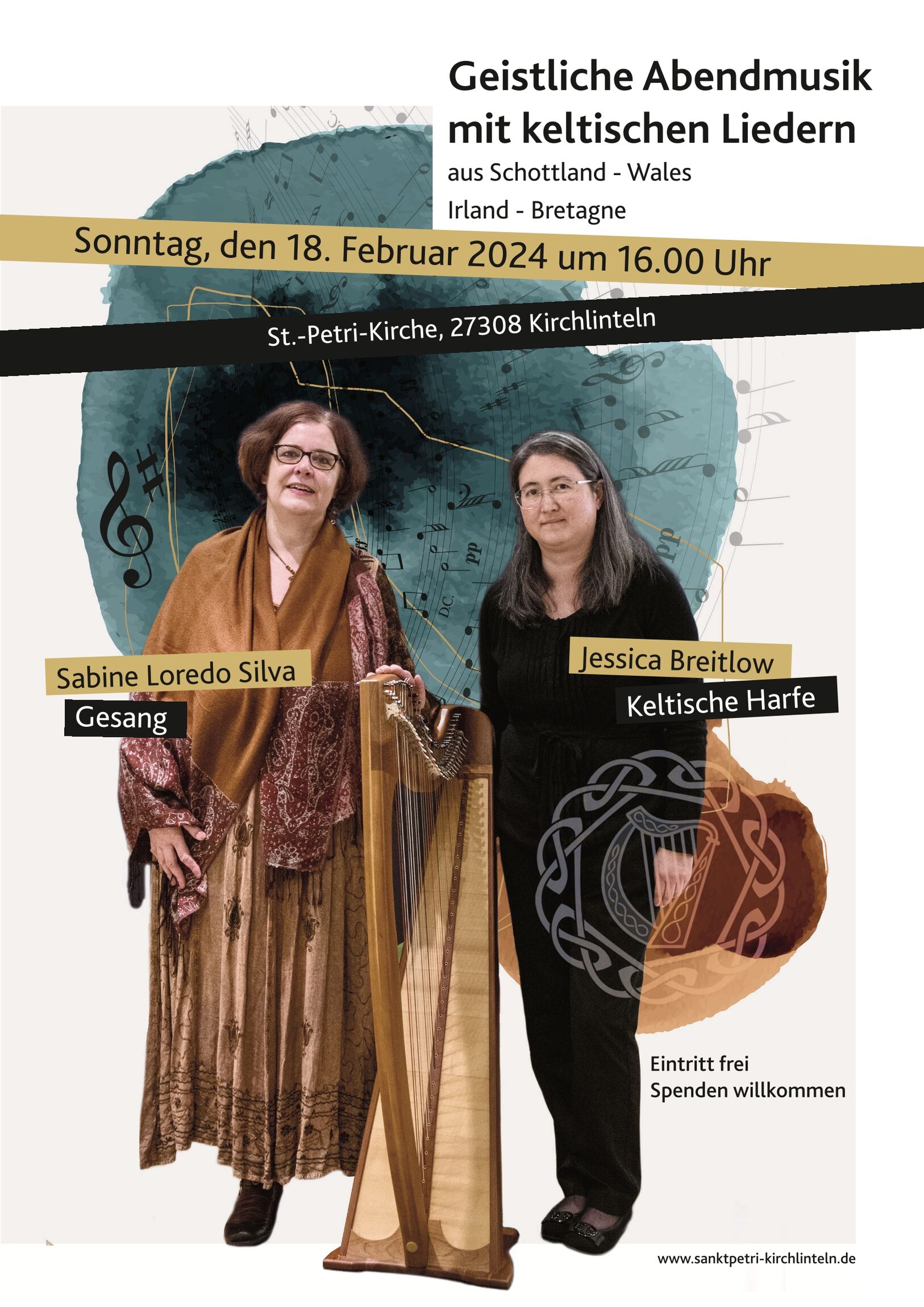 Am Sonntag, den 18. Februar 2024, um 16.00 Uhr präsentieren die beiden Künstlerinnen Sabine Loredo Silva und Jessica Breitlow ein Konzert mit Keltischen Liedern und Harfenklängen in der St. Petri-Kirche in Kirchlinteln. Der Eintritt ist frei, jedoch bittet die St. Petri-Stiftung der Kirchengemeinde um großzügige Spenden, die den Künstlerinnen und der Arbeit der Stiftung zugute kommen werden.