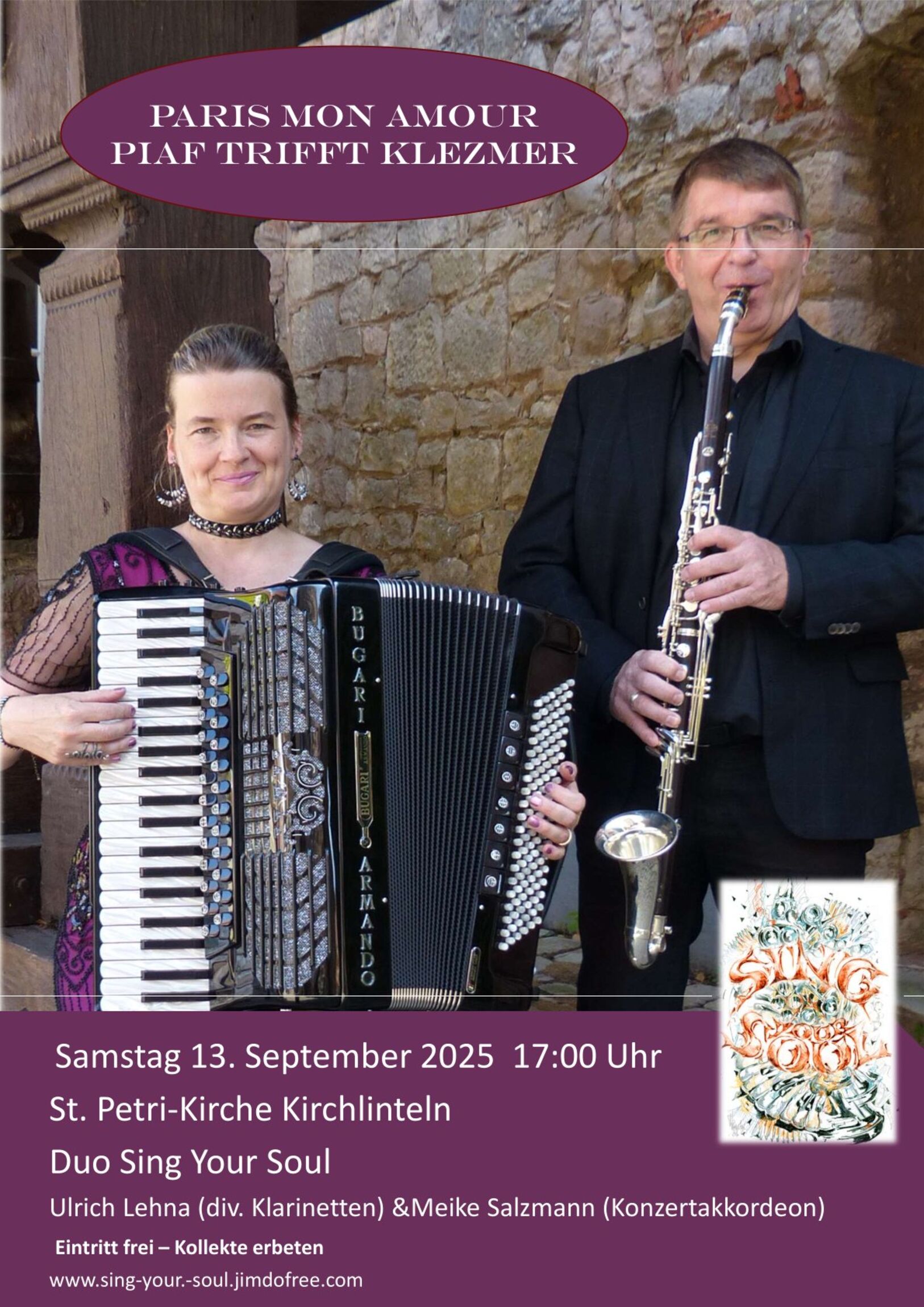 Am Sonnabend, den 13. September 2025, 17.00 Uhr, gastiert die Gruppe Sing your soul mit ihrem Konzert „Edith Piaf trifft Klezmer - Musik gegen das Vergessen“ in der St. Petri-Kirche in Kirchlinteln.