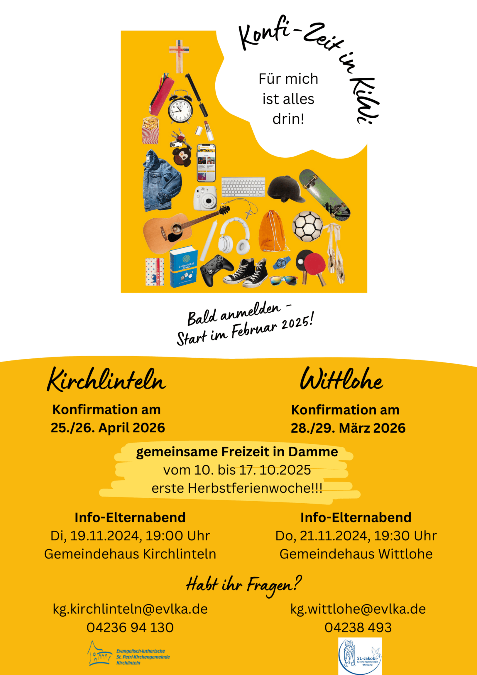 Für alle, die im Jahr 2026 konfirmiert werden möchten, startet Ende November die Anmeldephase. Dazu gibt es am 19. November ab 19 Uhr einen Elternabend im Gemeindehaus Kirchlinteln.